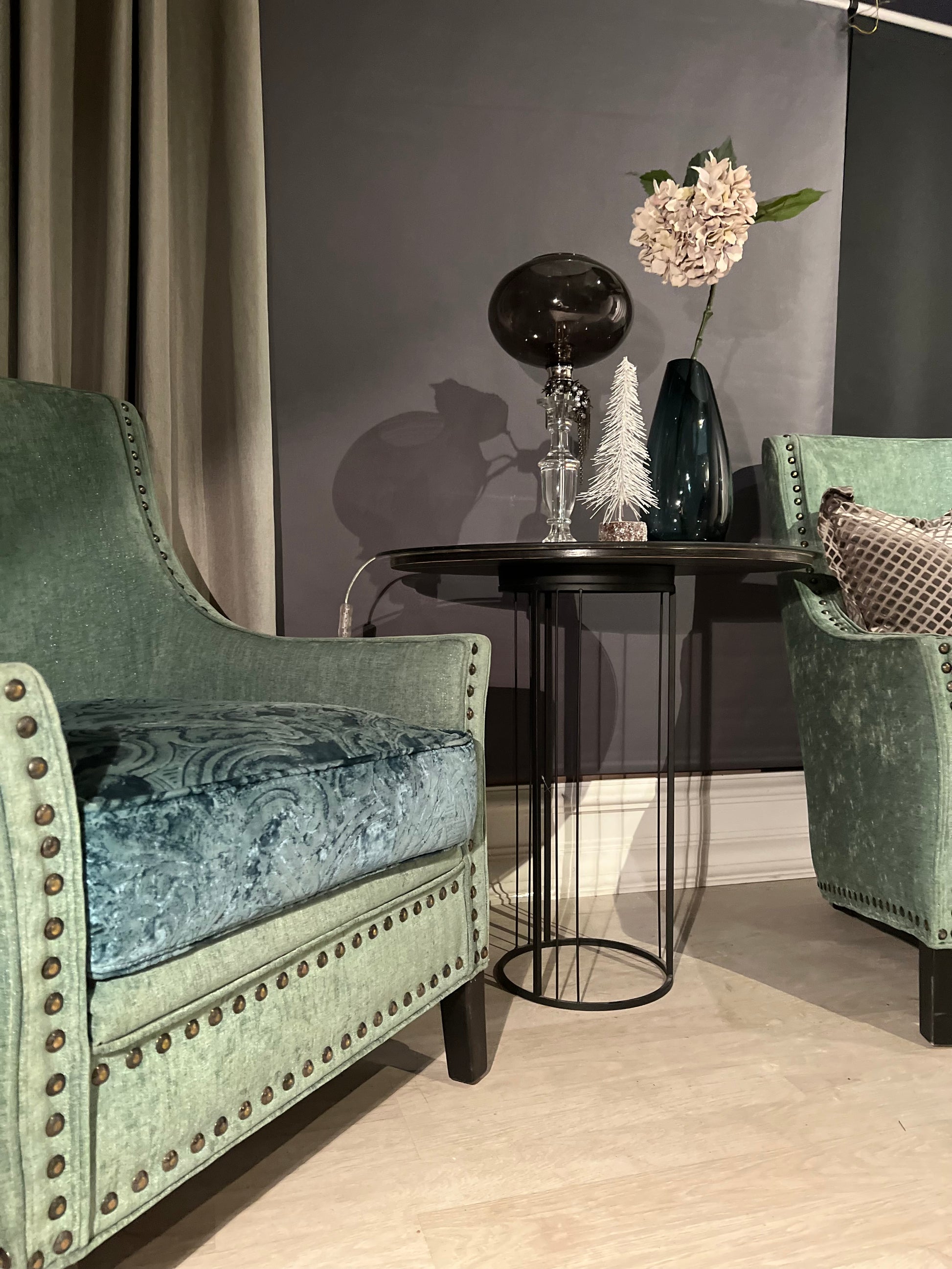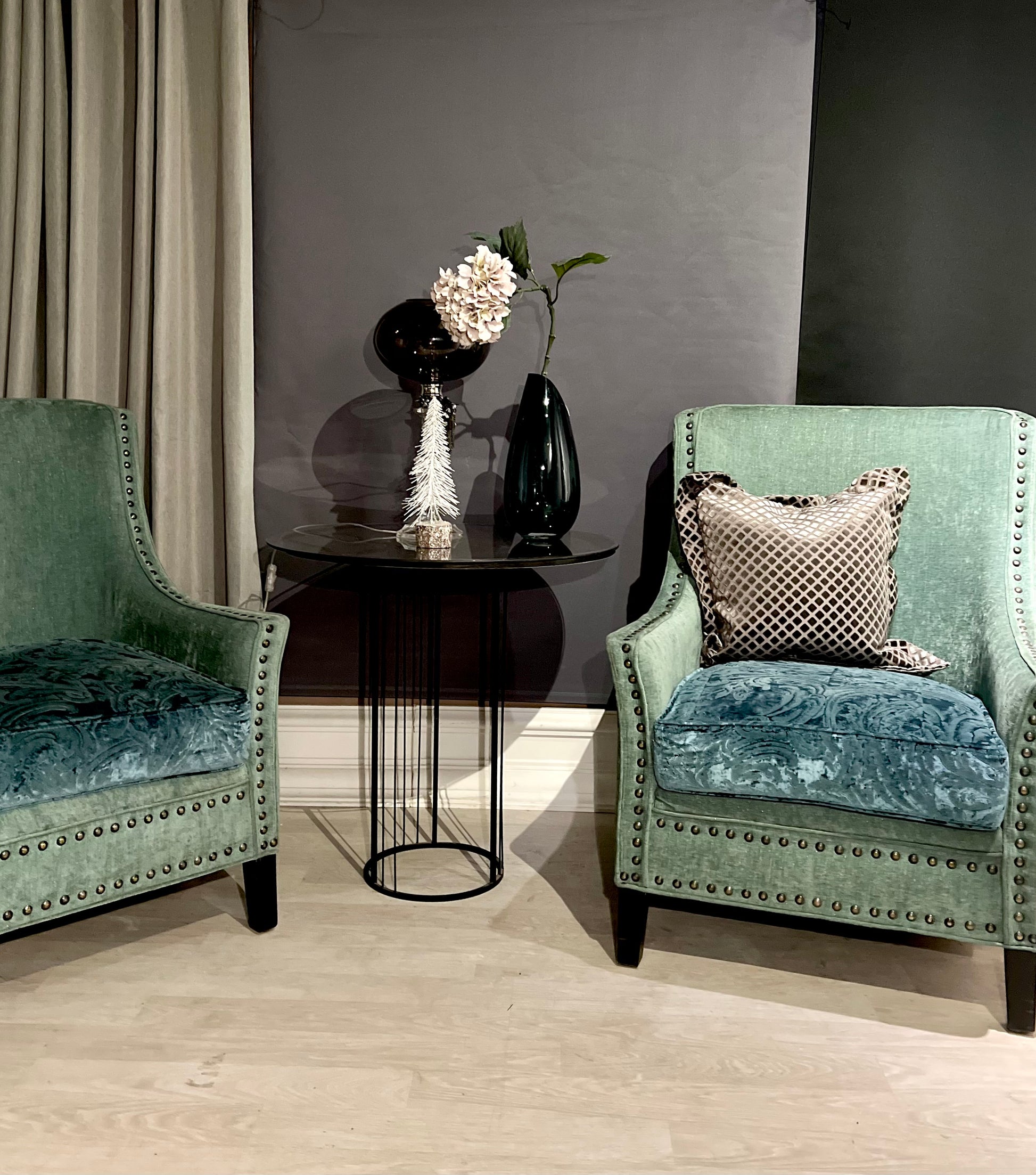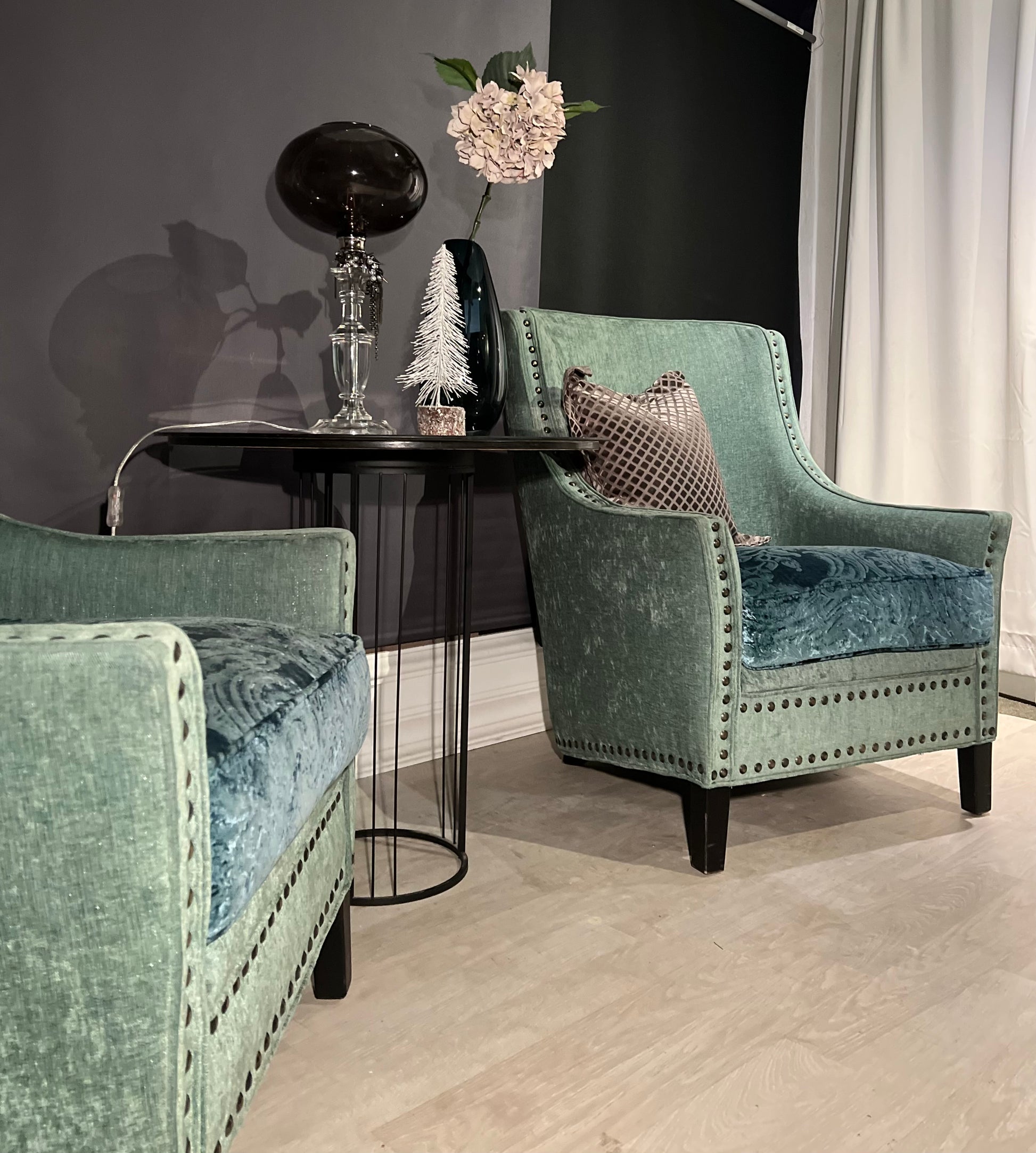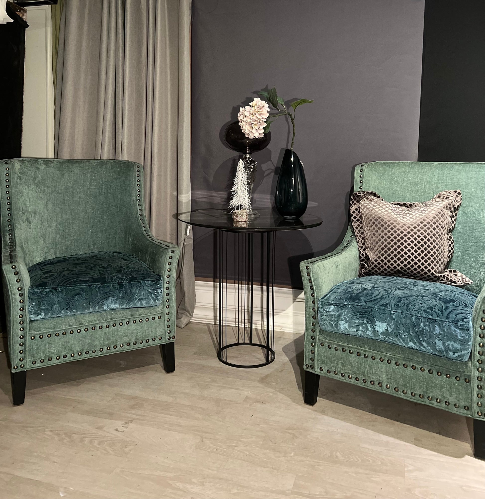 Lenestolene er trukket i et nydelig sjøgrønt fløyelsstoff med messingdetaljer, samt sittepute med brokadestoff.