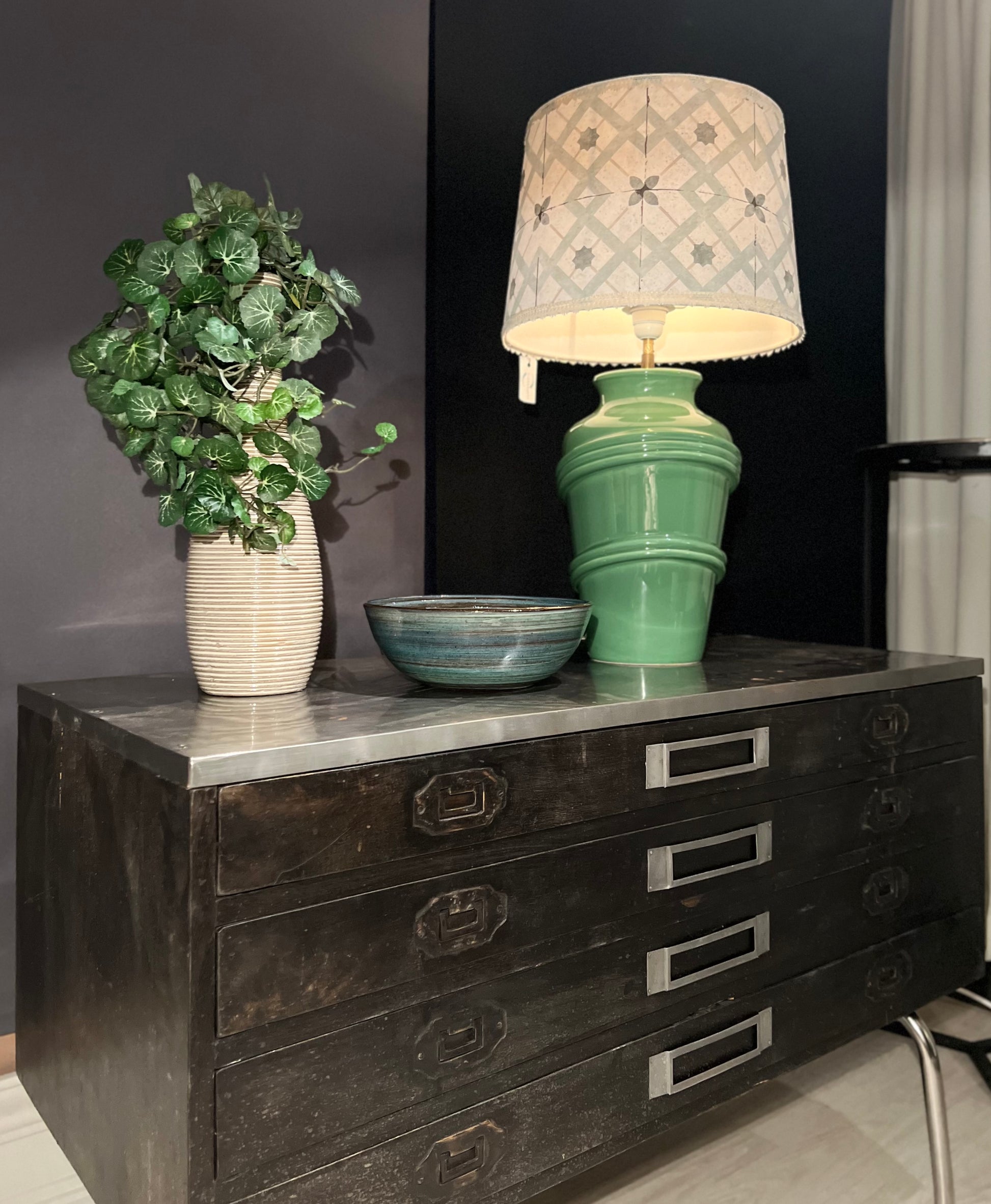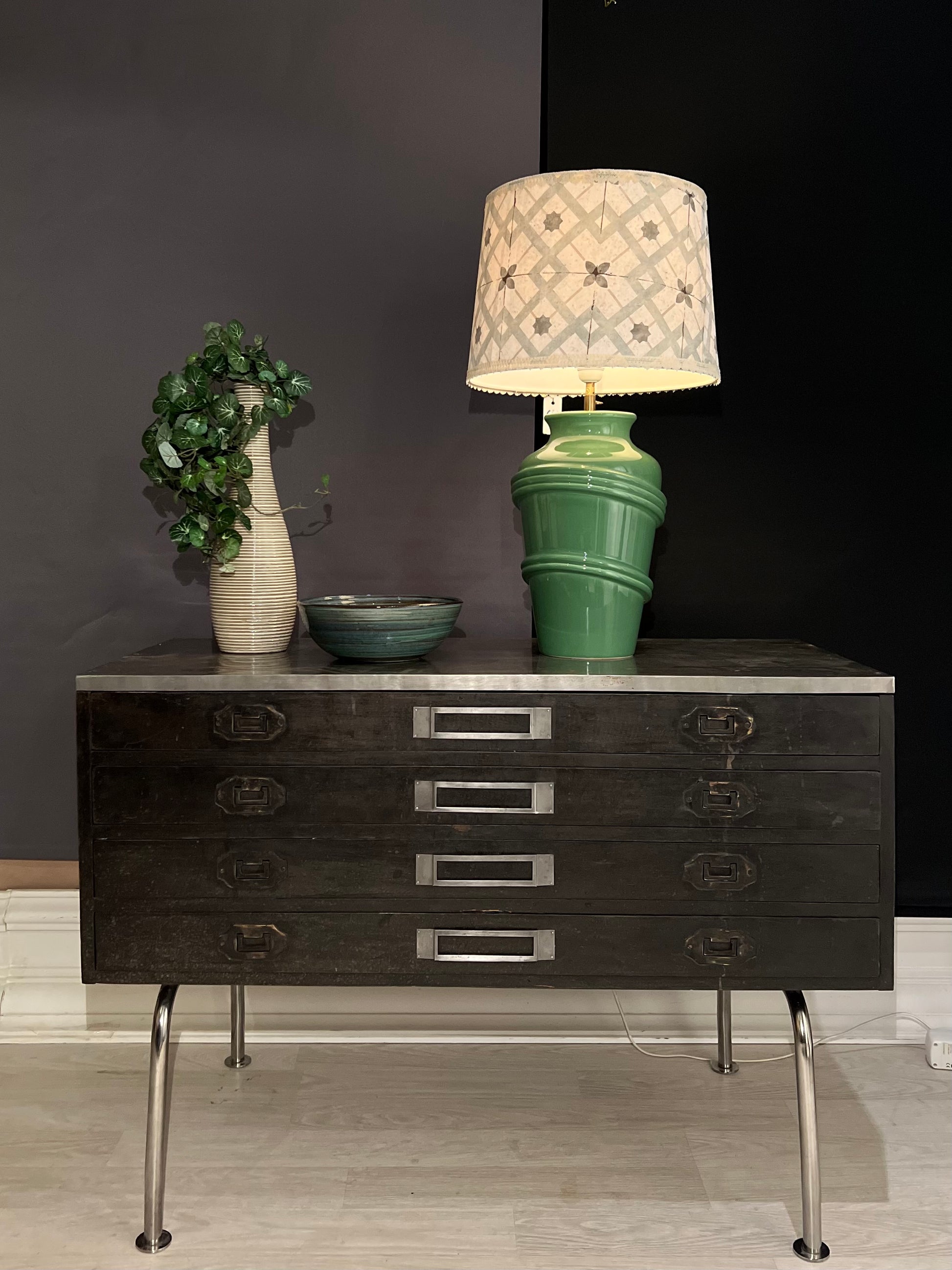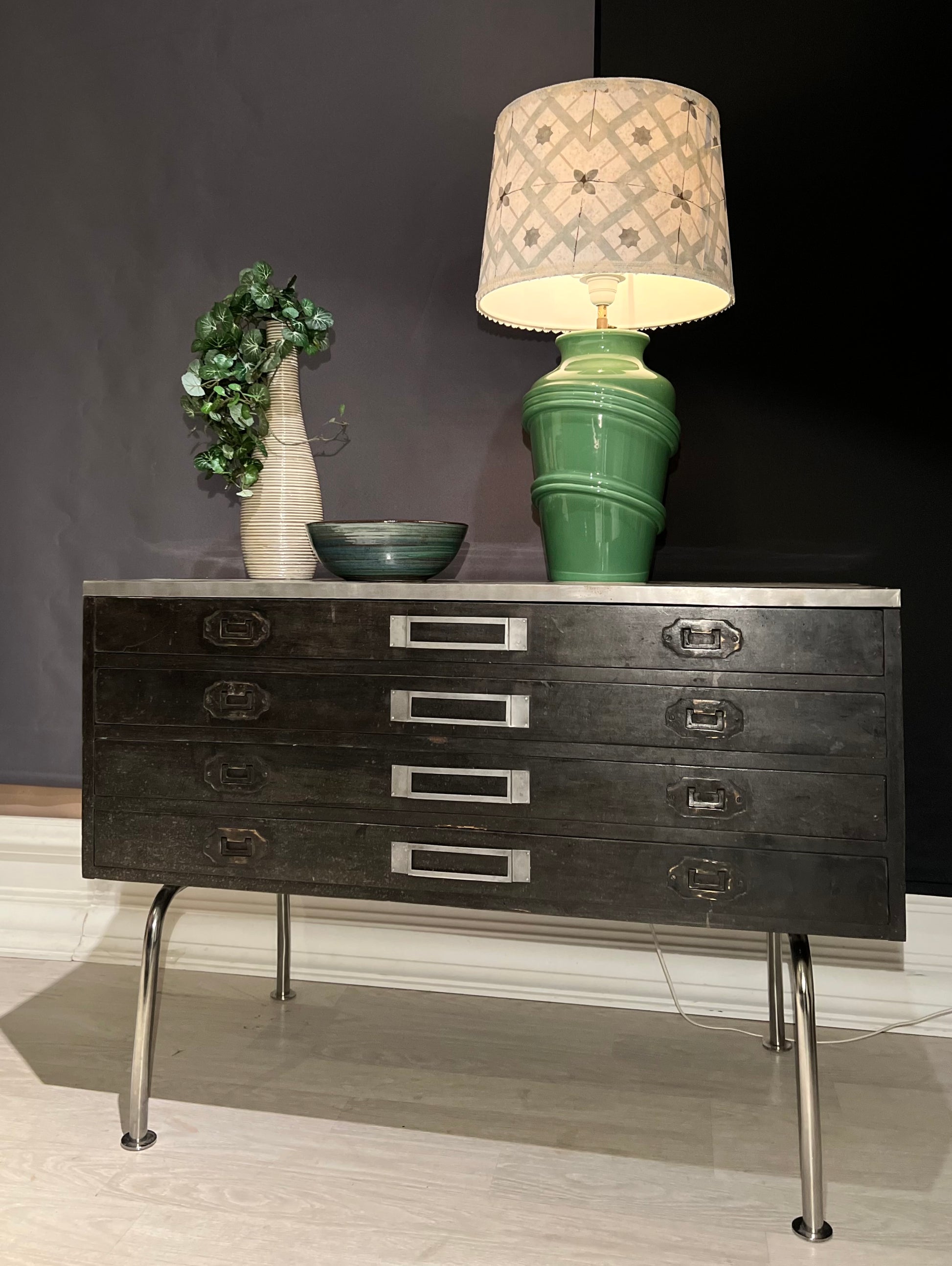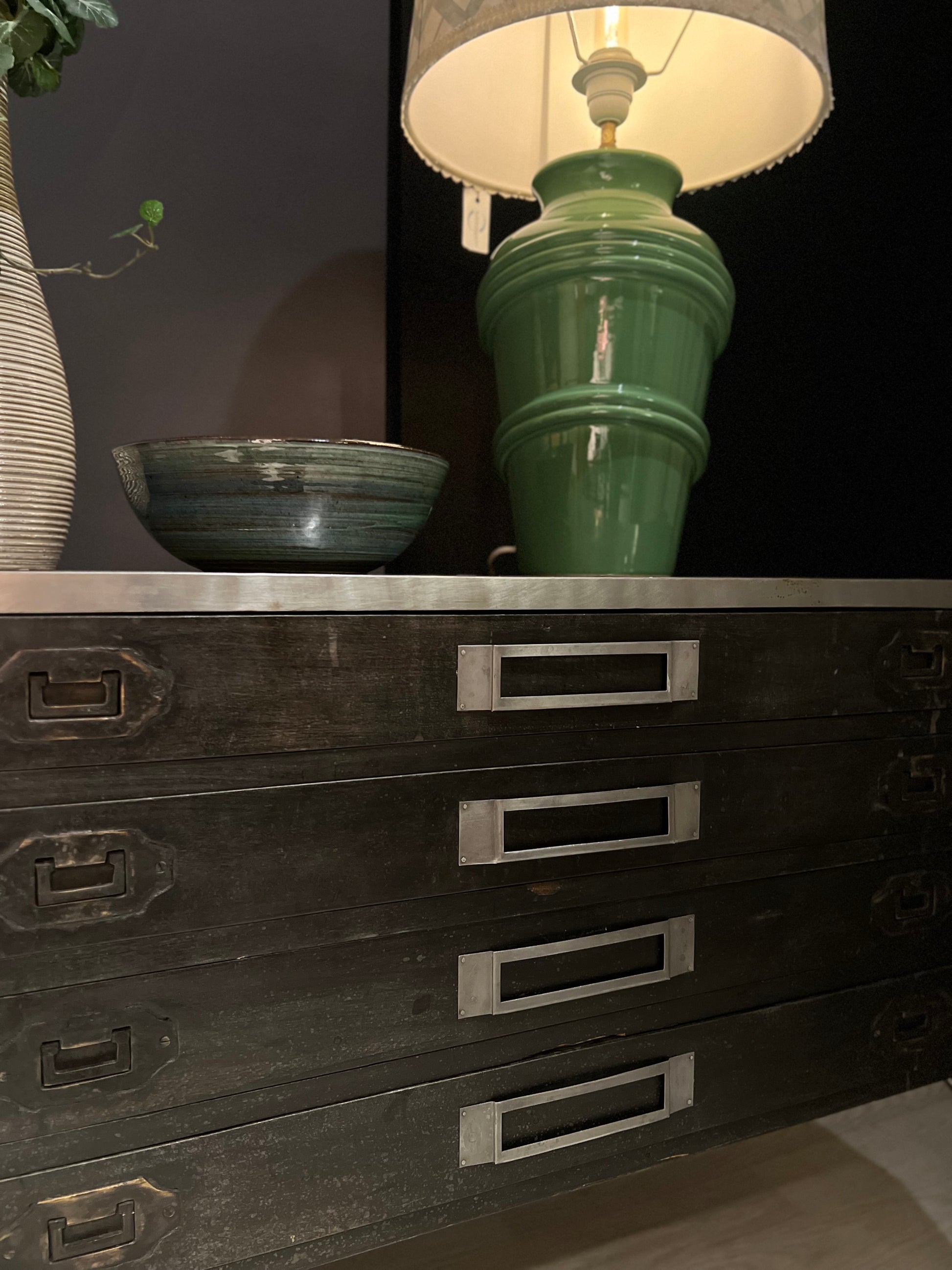 Kommoden har også heldekkende galvanisert metallplate på toppen, noe som gir møbelet en tydelig industriell stil.