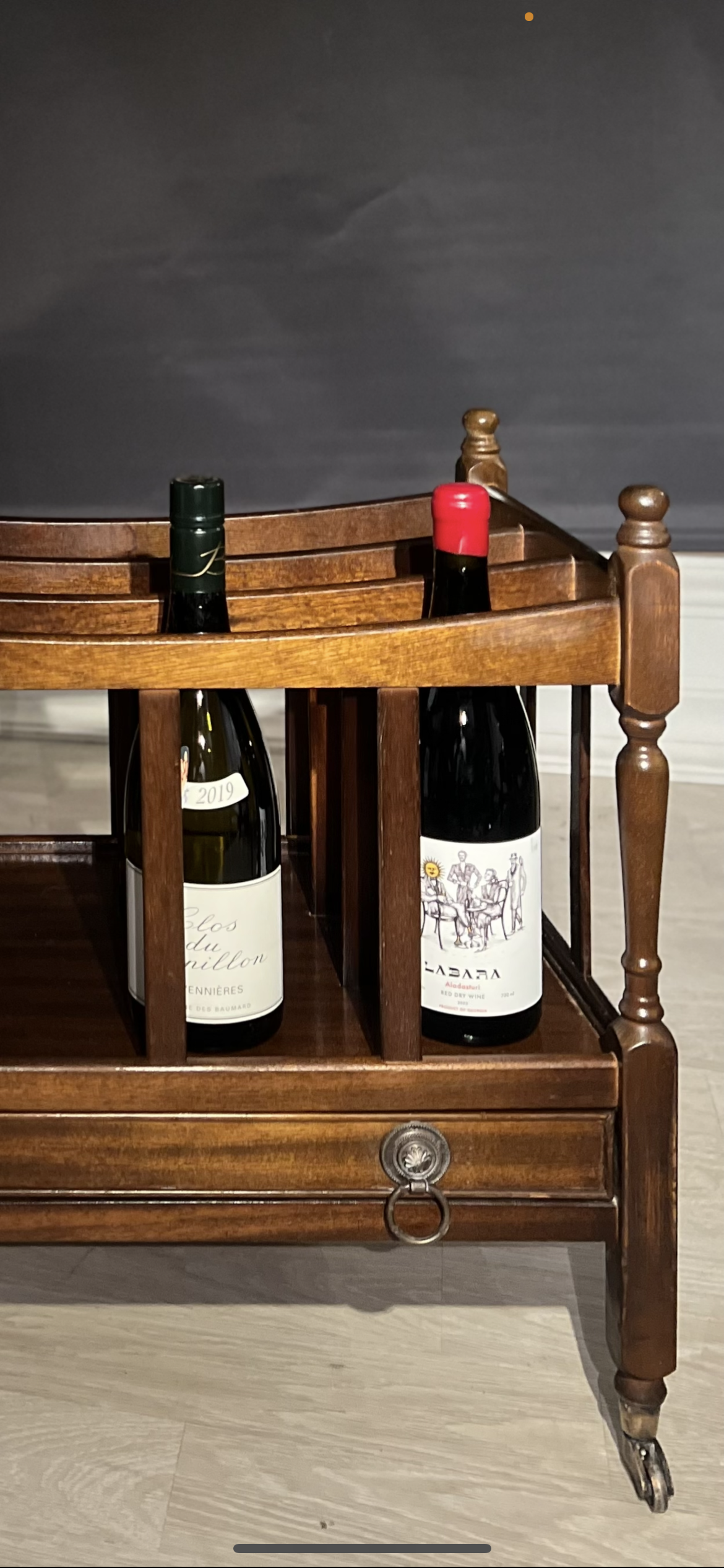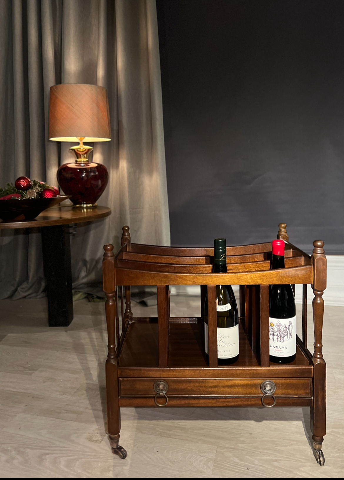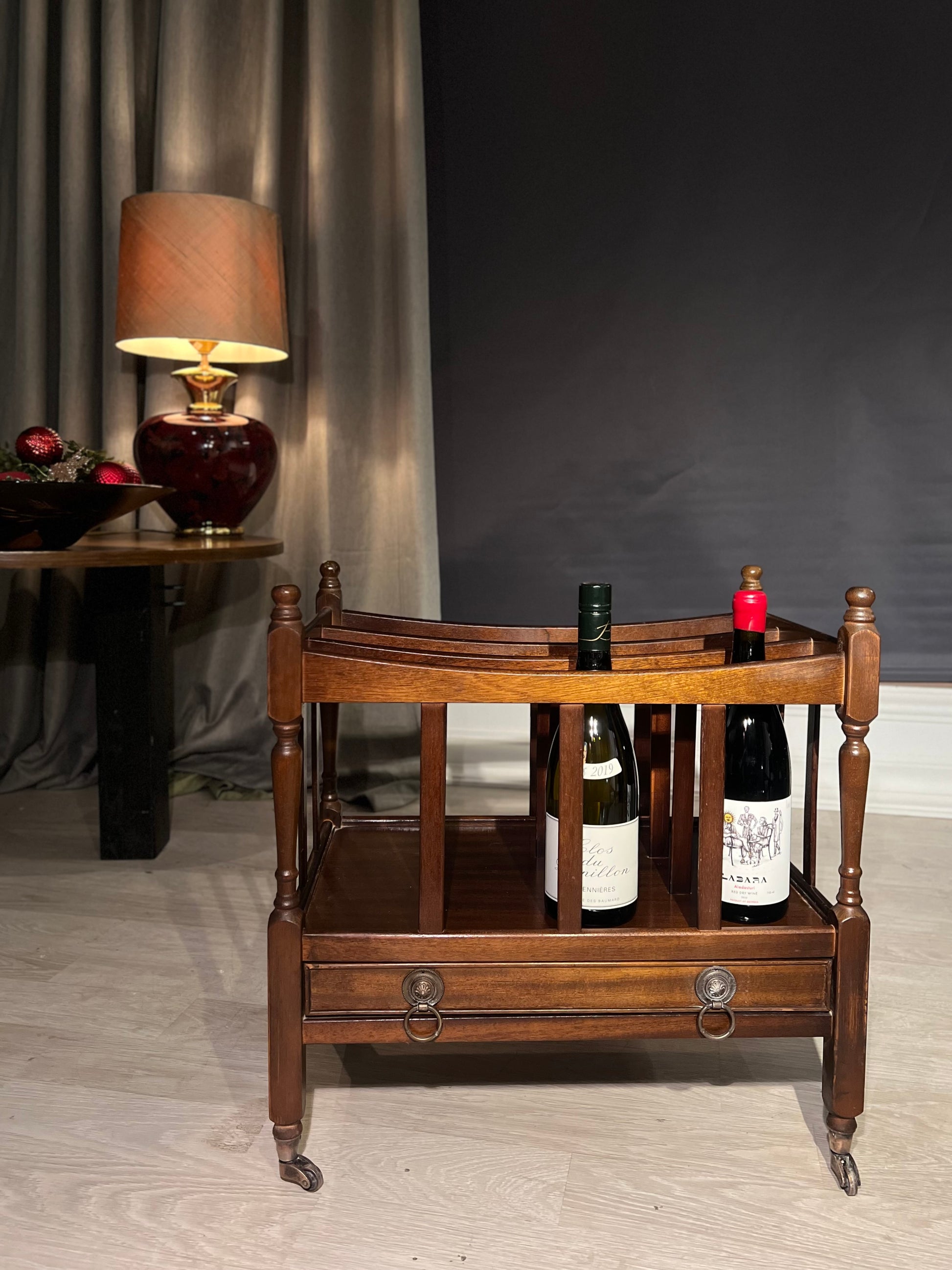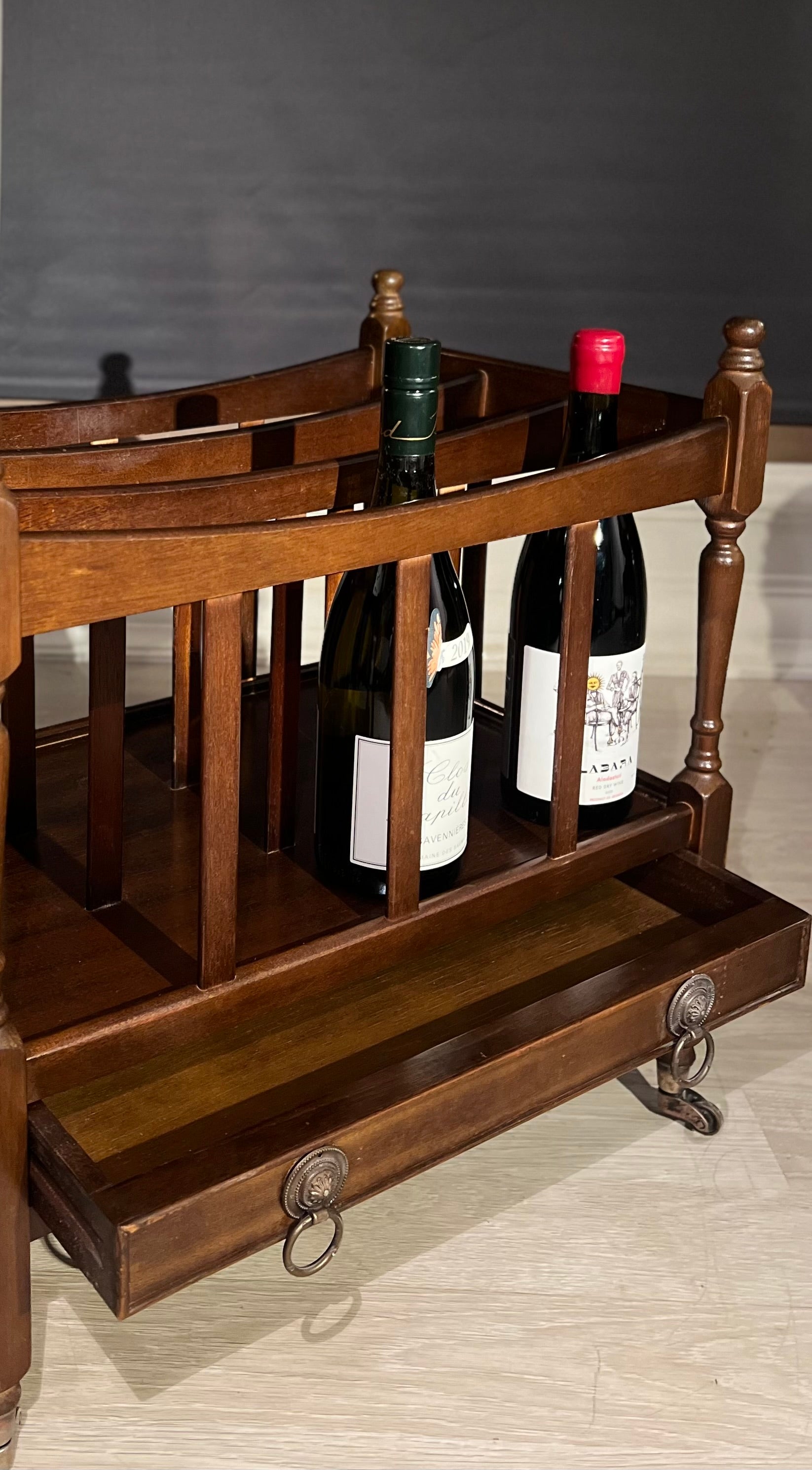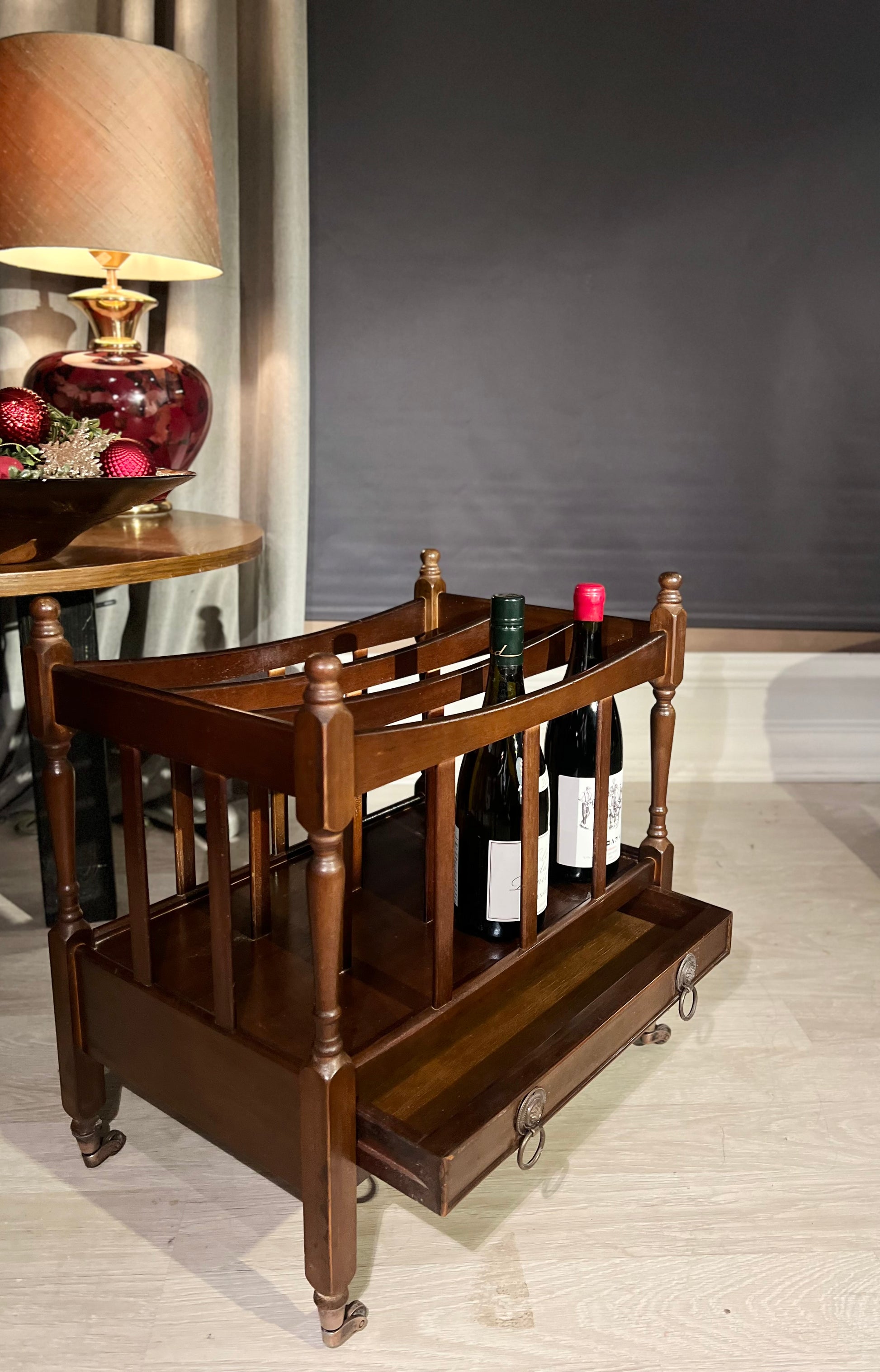Nostalgisk avisholder/ bartralle i brunbeiset eik med hjul og knotter i messing.