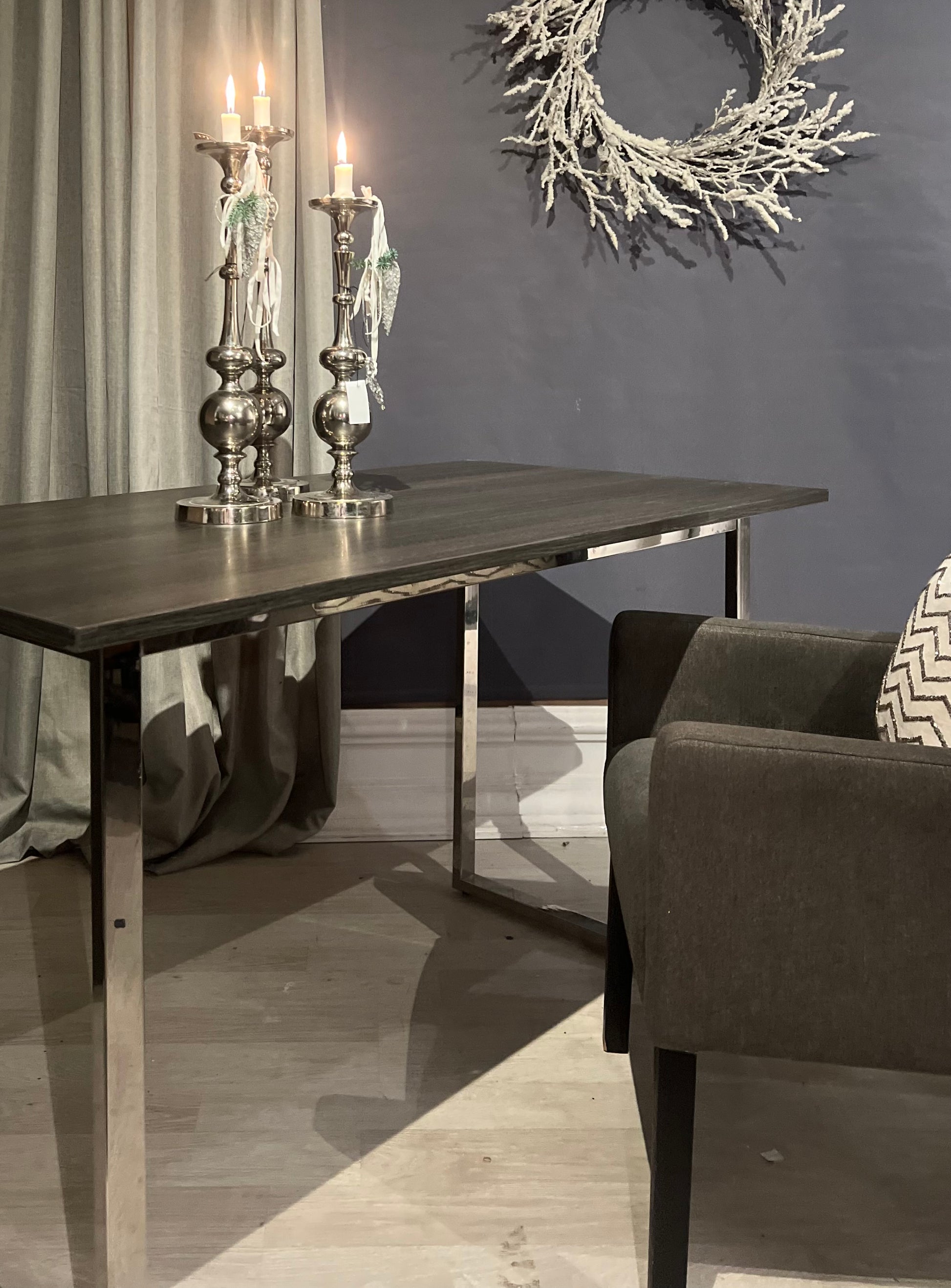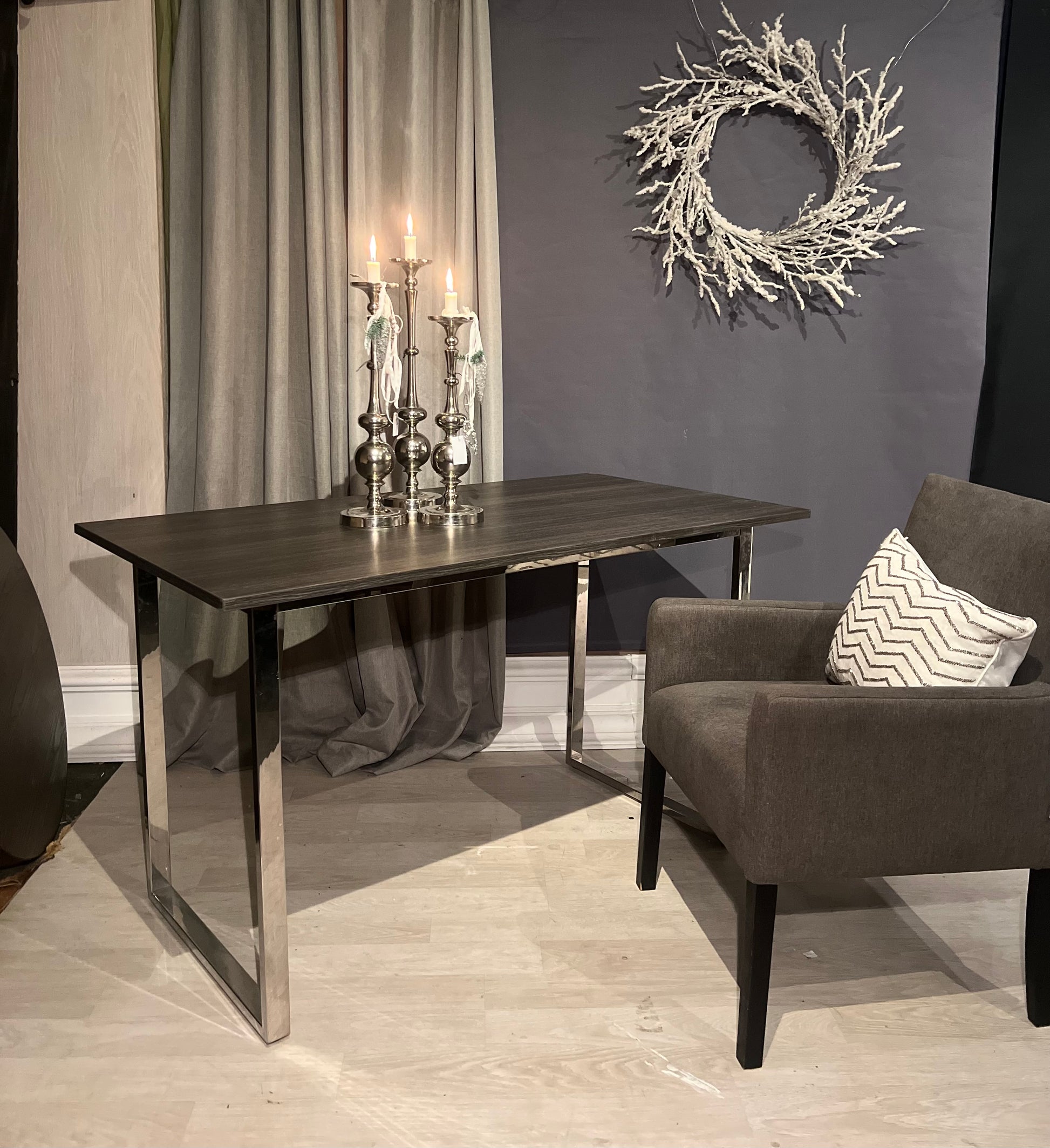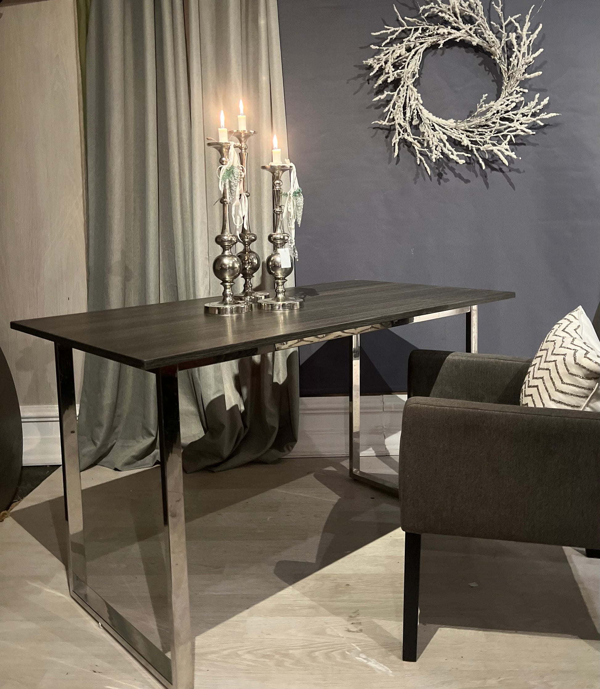 Bordet har et moderne uttrykk med rammeunderstell i blankpolert krom, samt rektangulær bordplate i kaldpresset finer.